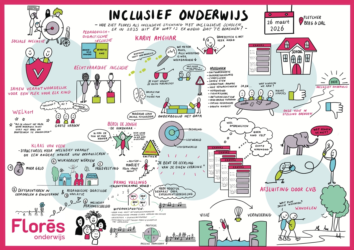 Onderwijsprofessionals gingen samen aan de slag met een 'canvas'. Ze tekenden uit hoe hun school er over tien jaar uitziet als iedereen er echt bij hoort. En door de diversiteit in groepen, is er echt Flores-breed gecreëerd. Dat zorgde voor mooie gesprekken over wat er nú al goed gaat en wat we nog moeten durven veranderen.